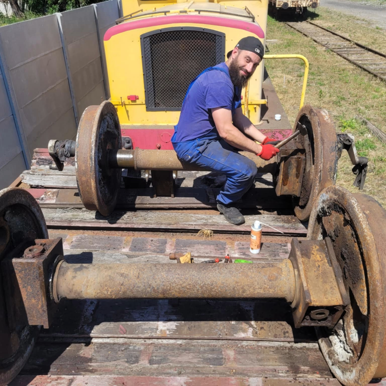 Séance de travail hier sous 34°C à l’ombre … démontage des boites d’essieux et nettoyage au Karsher. Nous n’avons pu démonter que 2 boîtes sur 4, les axes restants sont quelque peu… grippés.