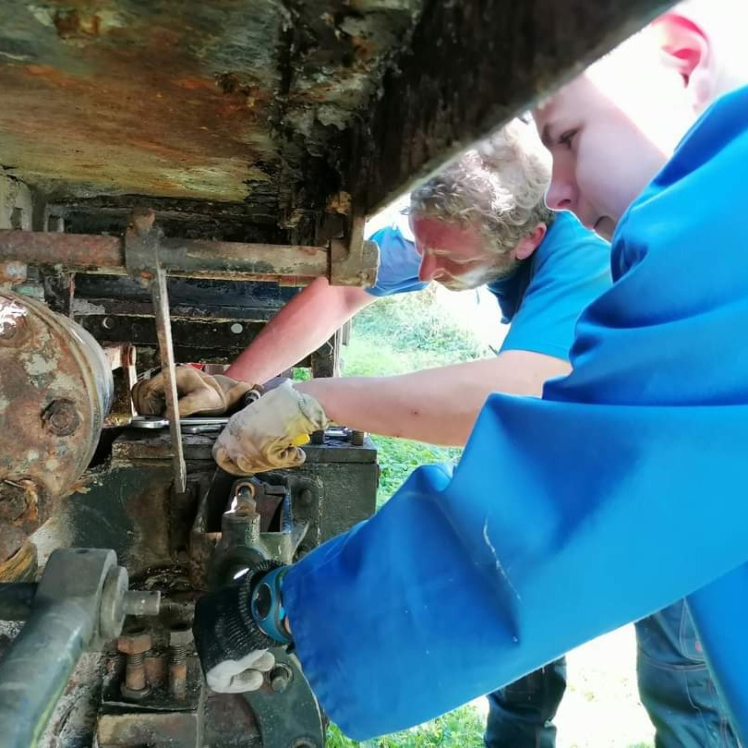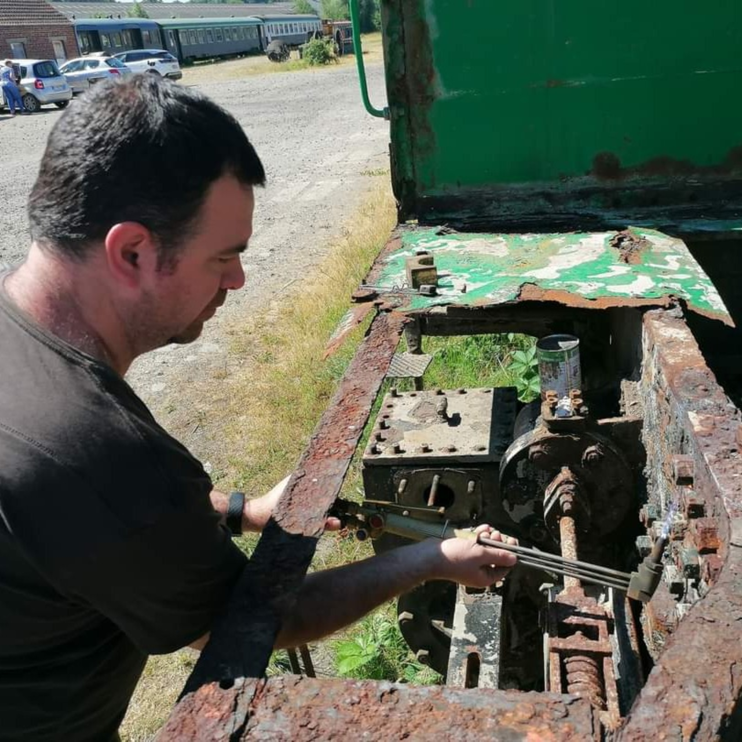 Séance du jour sous un beau soleil. Nous avons franchie une belle étape avec le démontage de la bielle d’accouplement côté chauffeur, la dernière bielle à démonter. Sylvain, nouveau membre et voisin du CFTVA nous a rejoint dans cette séance de démontage. La prochaine étape sera le démontage de la timonerie de frein, ça s’annonce déjà complexe après une après midi à taper dessus sans résultat!