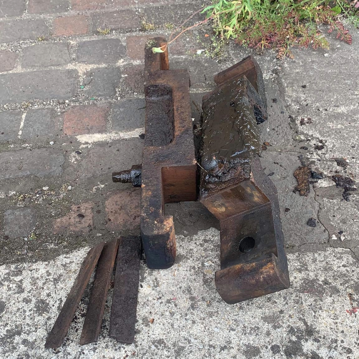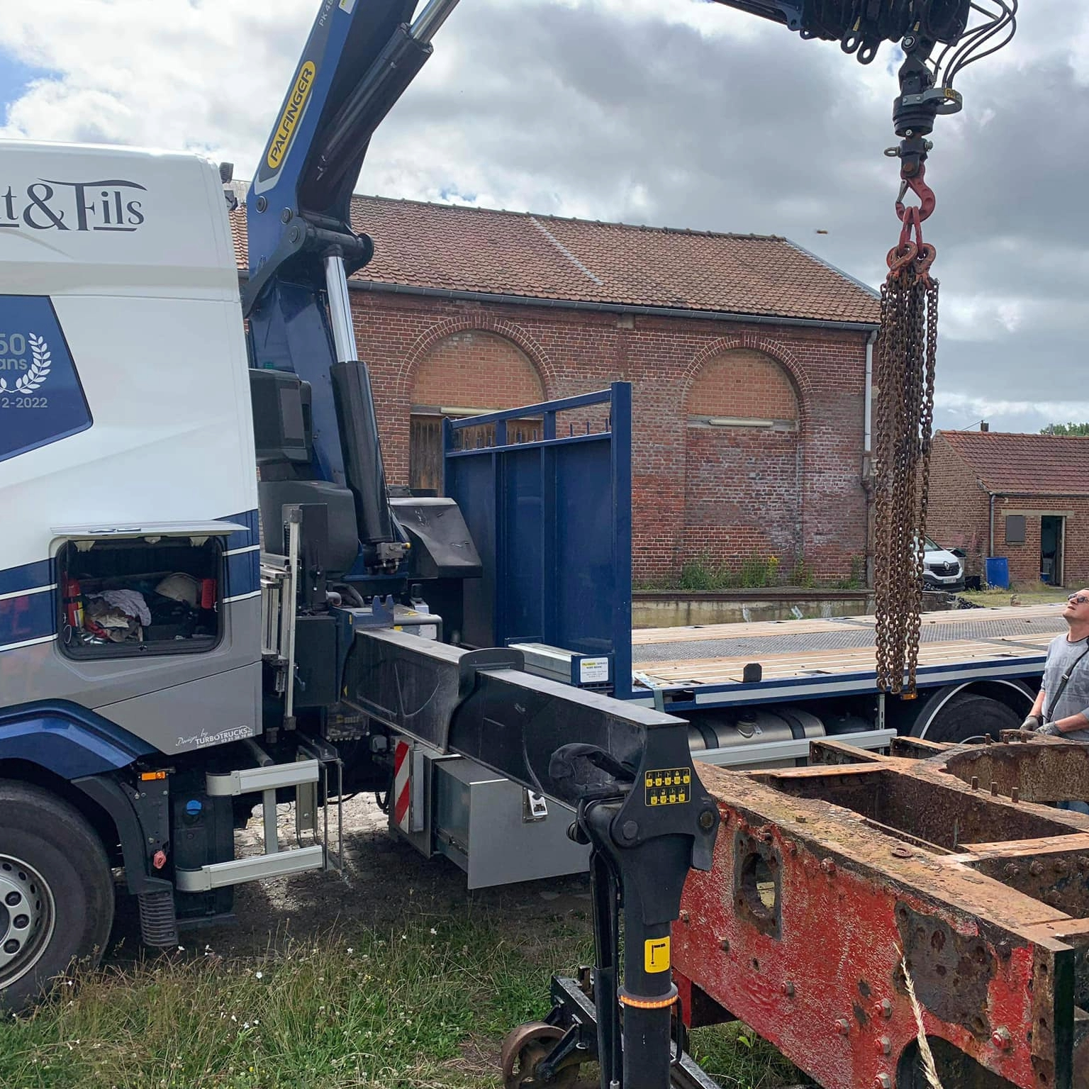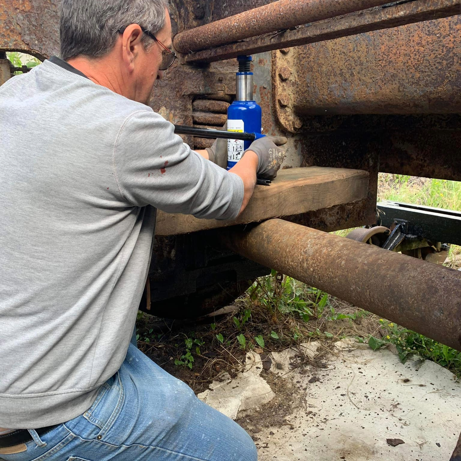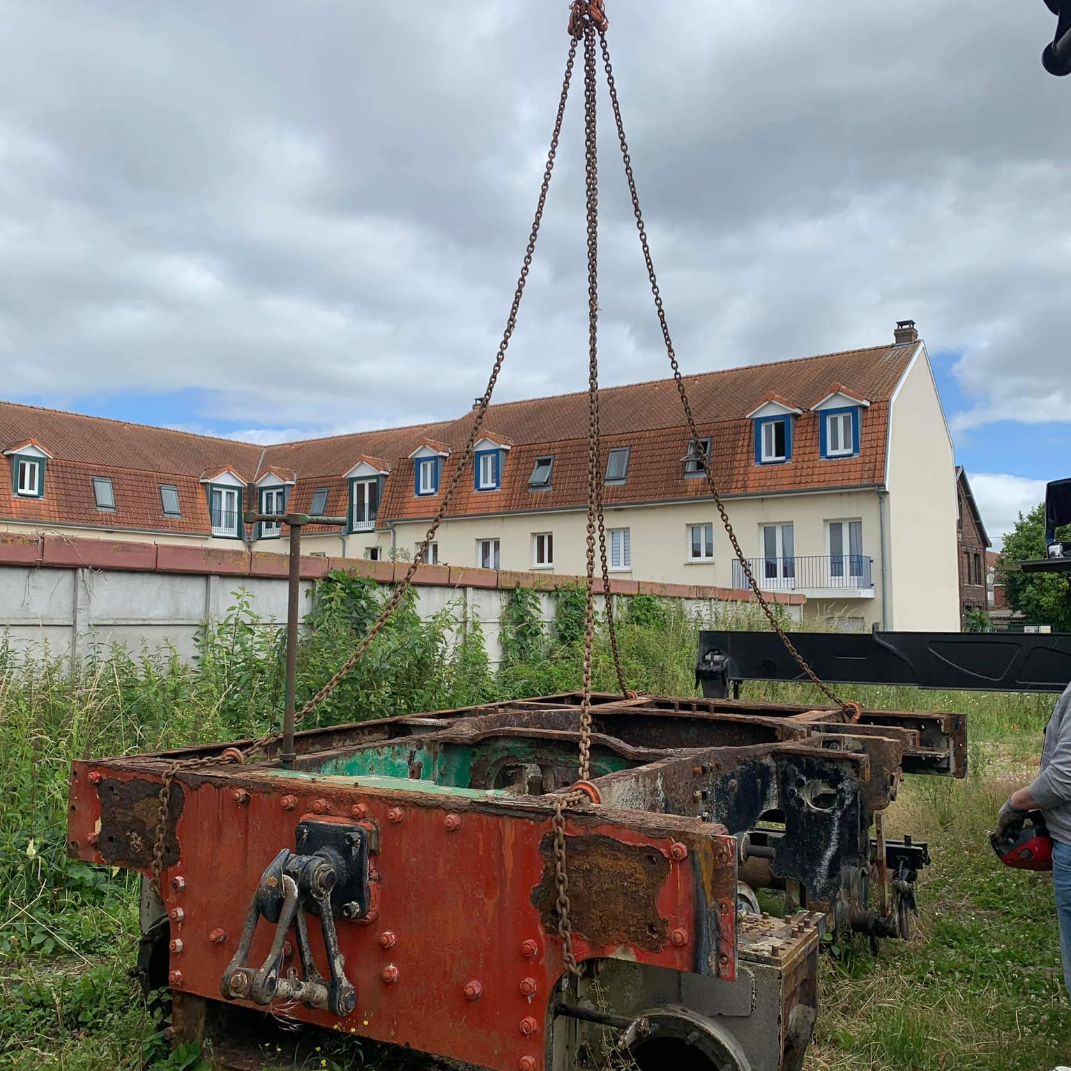 Aujourd’hui une grande étape dans la restauration de la machine : le levage du châssis afin de sortir les essieux. Le levage fut difficile mais les essieux ont bougés. Il reste un point dur que nous allons traiter avant de renouveler la tentative. Merci à Sénécat pour le grutage et la patience. Merci à l’atelier de la Doller pour les conseils Merci à Guillaume pour avoir orchestré l’opération.