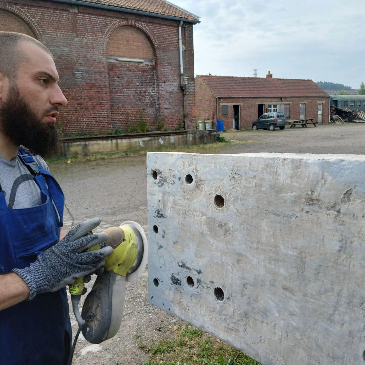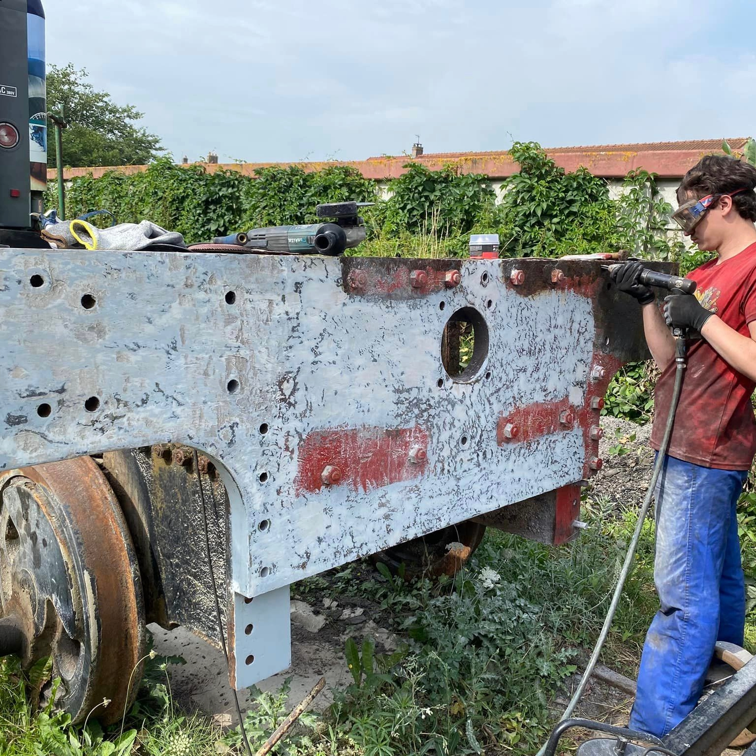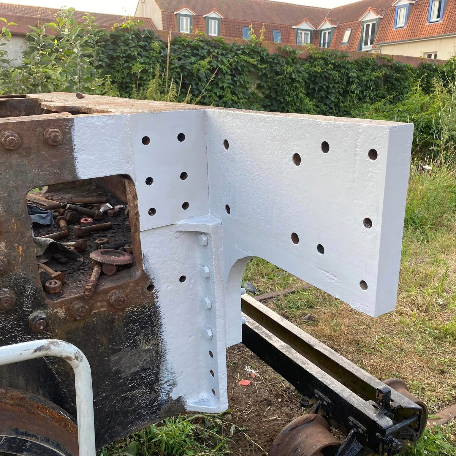 Après masticage de la traverse avant, l’heure du ponçage. Un premier ponçage pour dégrossir puis un nouveau masticage plus fin et un nouveau ponçage avant apret et peinture… À suivre !!!